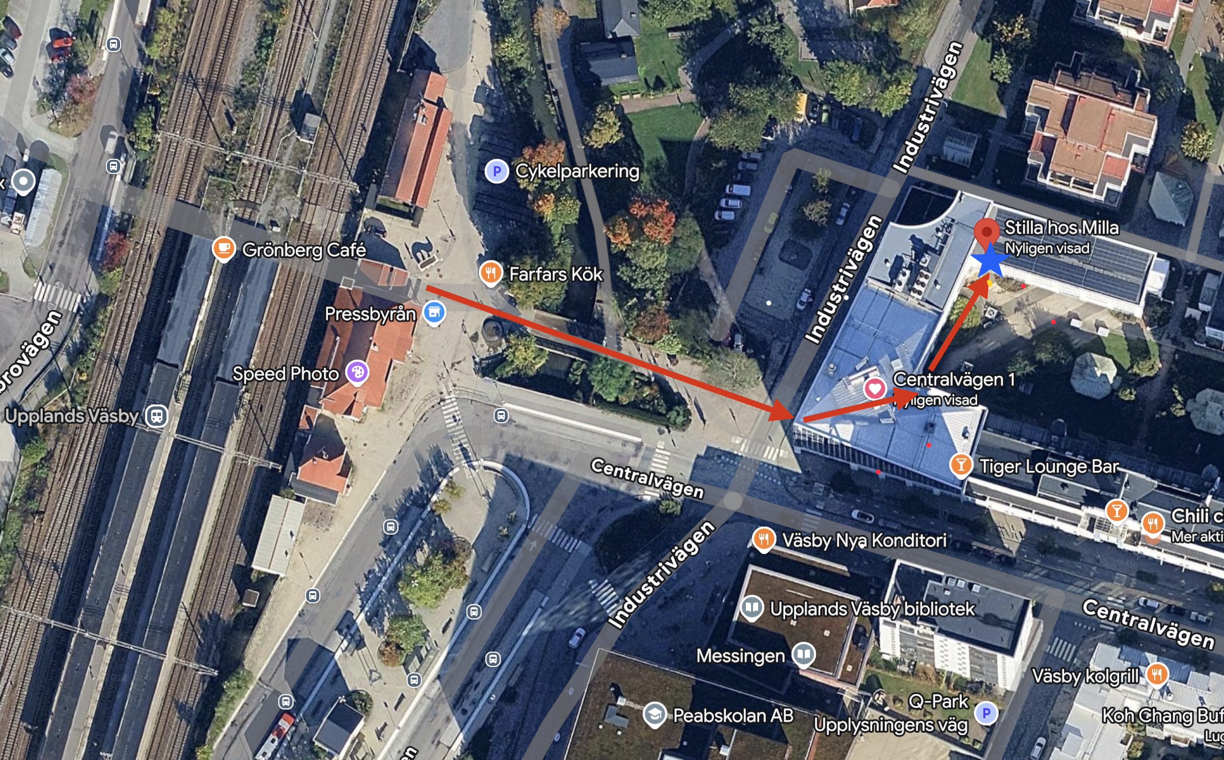 Röda pilarna på kartan markerar hur man promenerar från stationen till salongen.